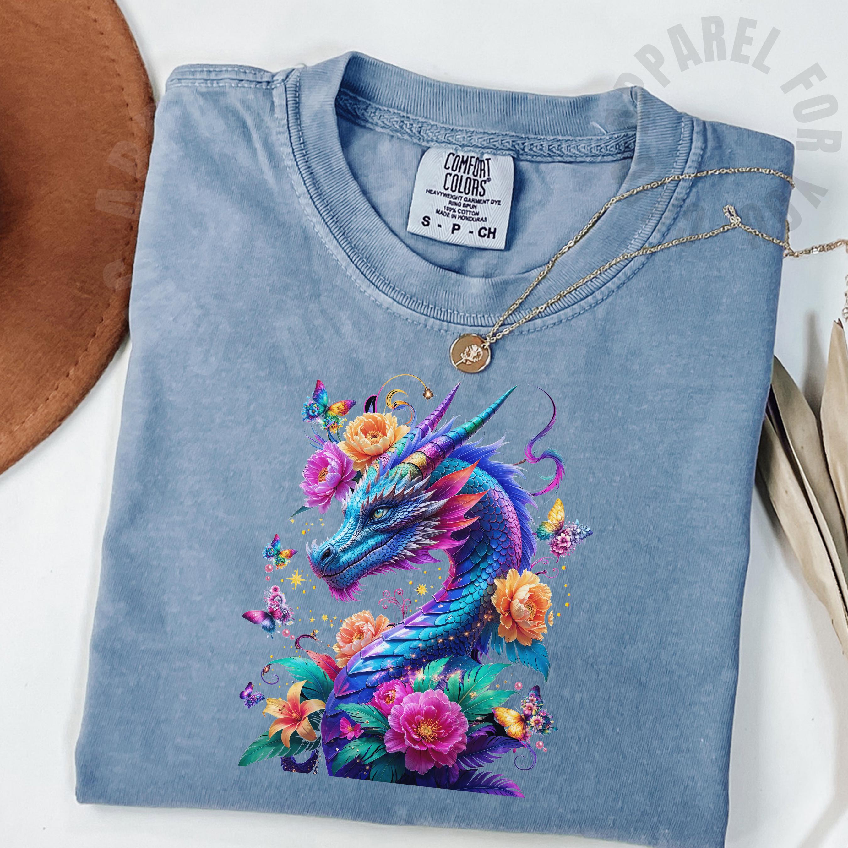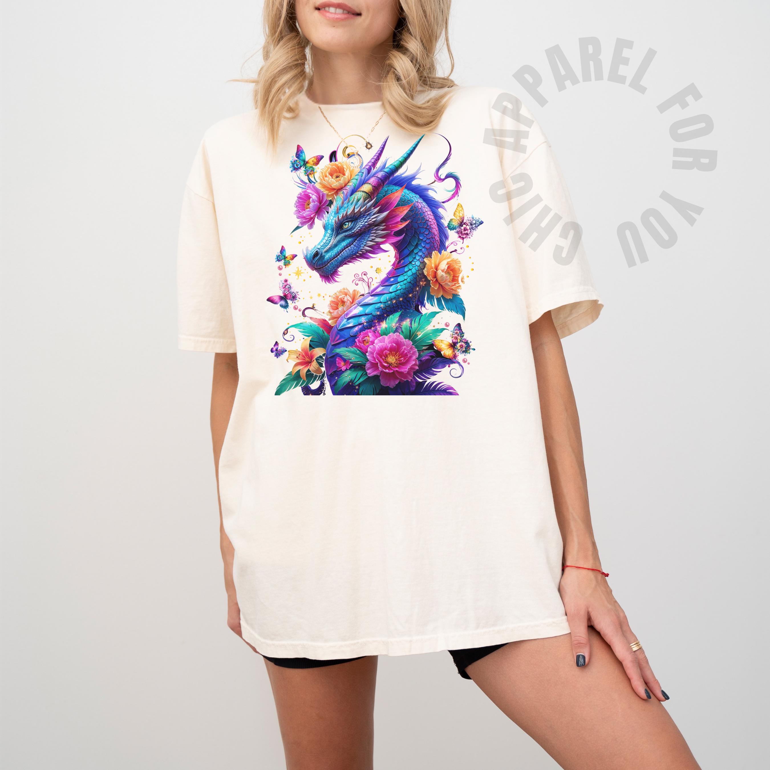 This Dragon shirt is a perfect gift for all dragon enthusiasts Inspired by Medieval and the Magic of beast legends Vibrant watercolor dragon surrounded by colorful flowers and butterflies, Unleash your inner Dragon Rider with our Mythical Dragon-themed graphic.
